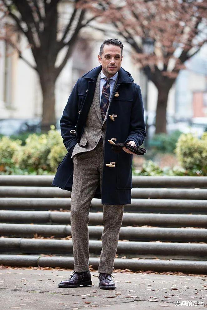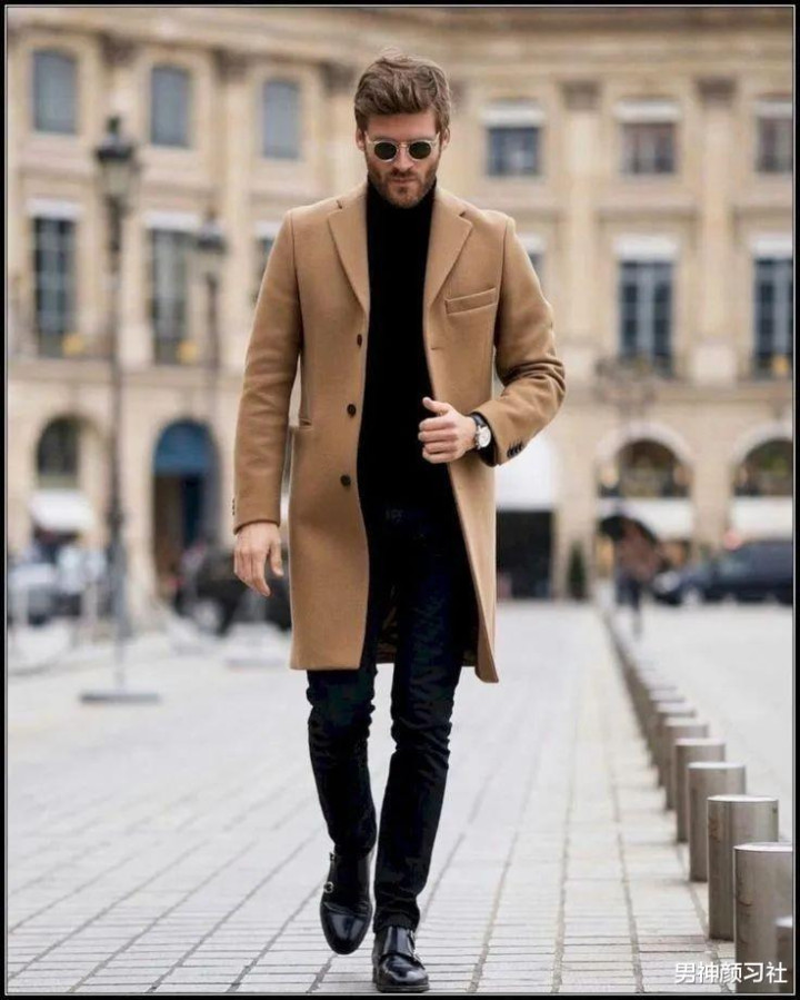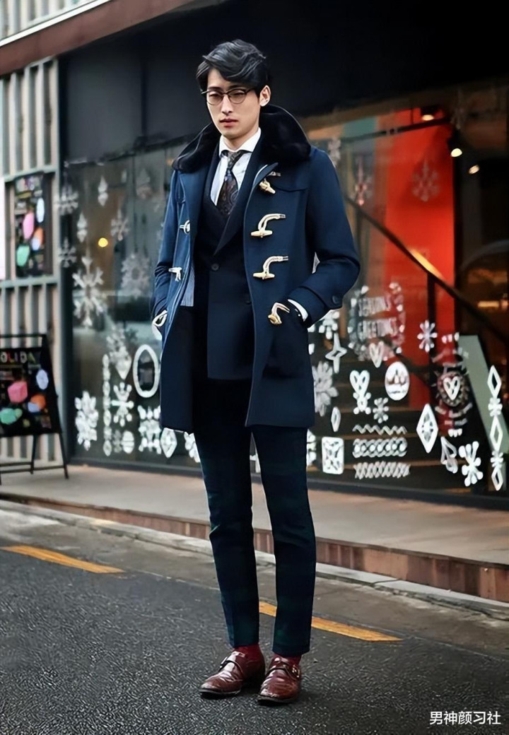 我发现今年羊角扣大衣也非常受男生欢迎。牛角扣大衣里藏蓝色的人气是最高的,我经常在街上能看到男生们这样穿,基本上也是选和你身形差不多的样式就好。太长会压制身高,长度在膝盖上方10cm左右刚刚好。