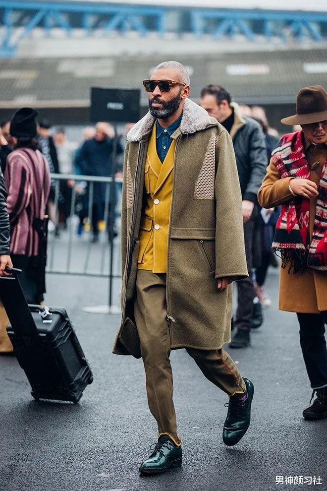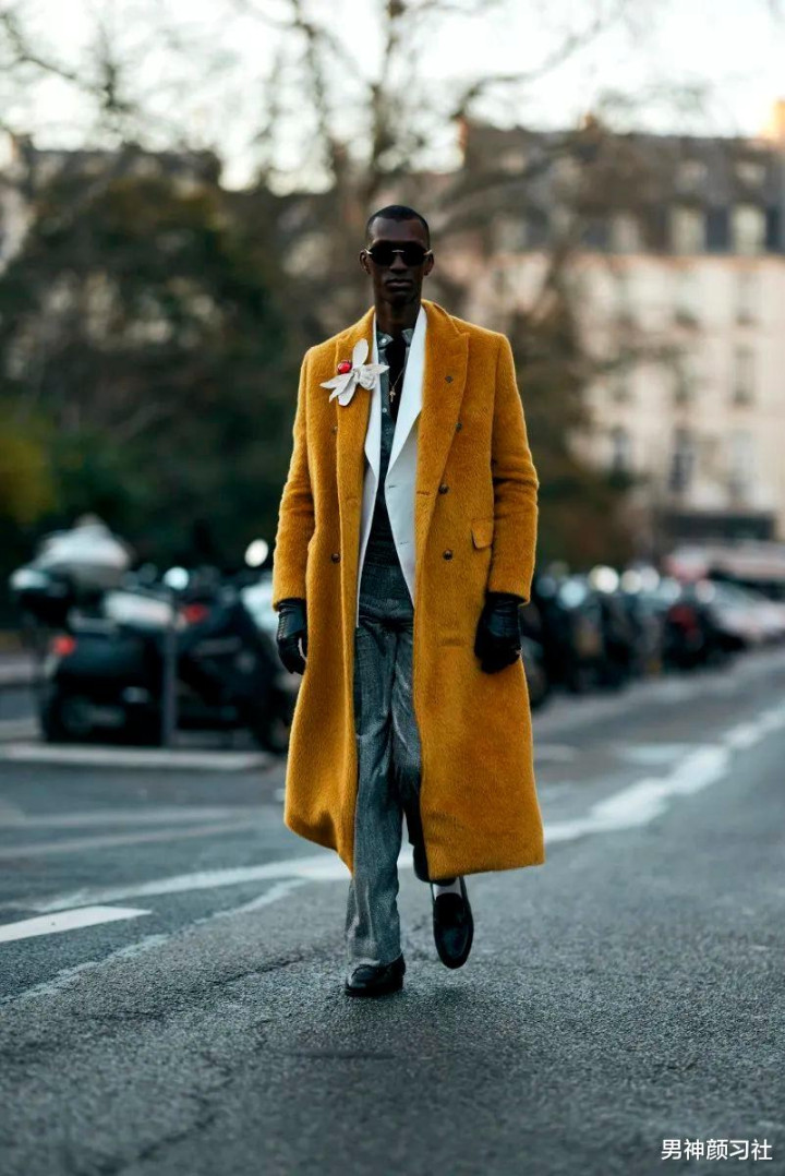 这套也是差不多的原理,他用了棕色大衣搭配亮色系内搭。尤其在冬天,想要让自己穿得看上去不那么沉闷,就可以试试看这种明亮的黄色。尤其皮肤白的人,穿起来很能凸显你的特点。此外,黄色和蓝色也是秋冬的一对CP。