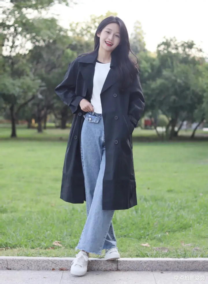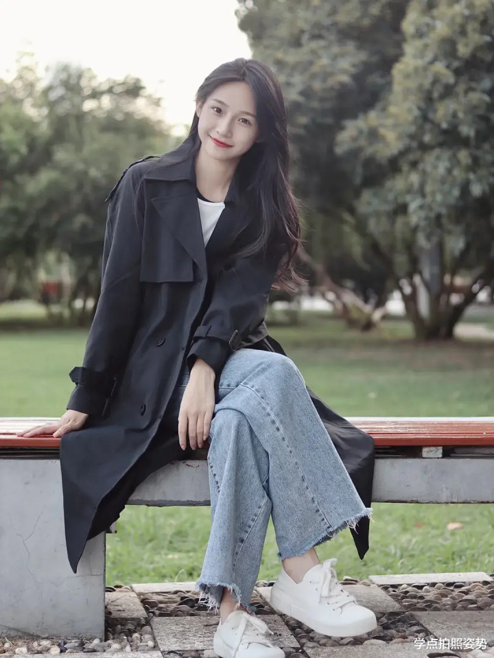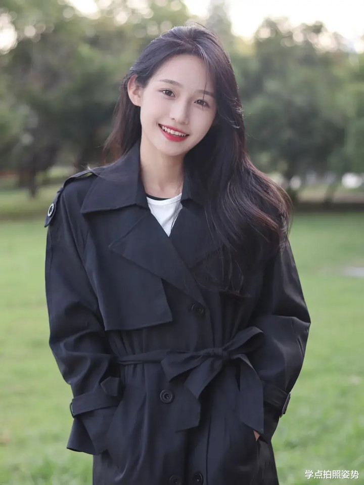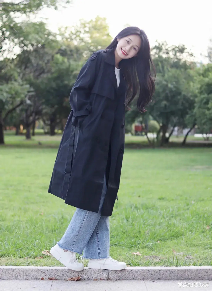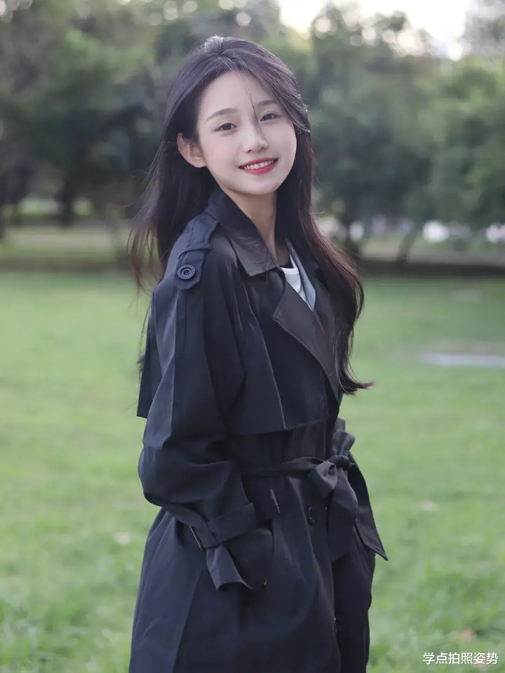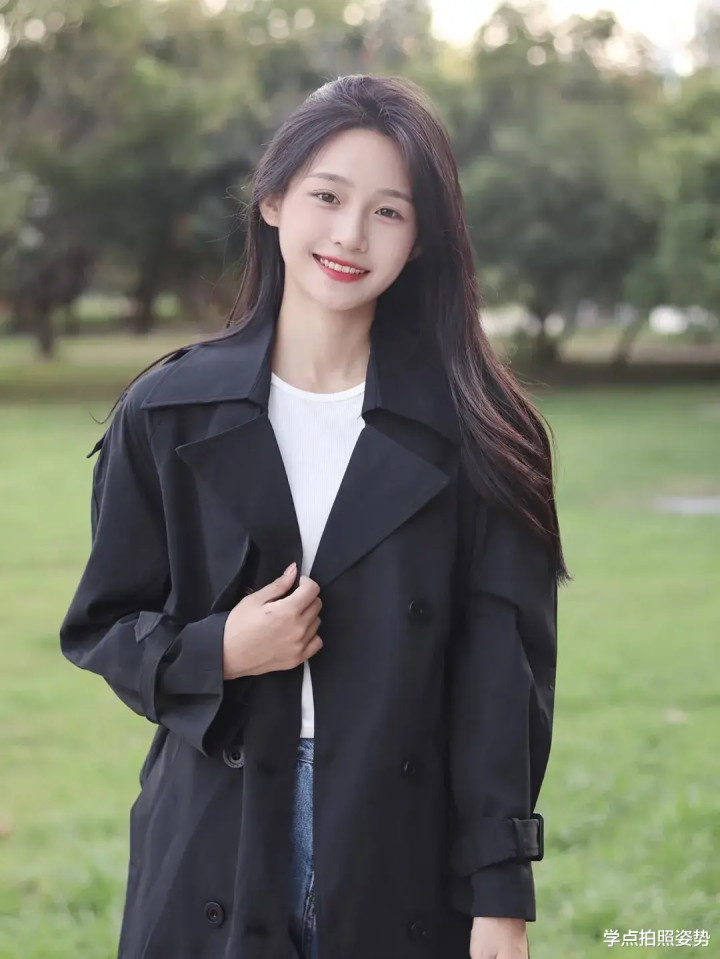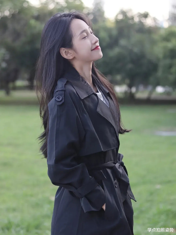 黑色风衣特别适合搭牛仔裤,简约干净又利落。拍半身照时,我们可以稍微将风衣敞开一点,手扶衣襟,微微歪头笑看镜头,可以将头发散下来,更为温柔淑女。利用绿植、草地等作为背景,将人物放在中间,并适当虚化背景,轻松展现优雅气质,简单又好拍。
